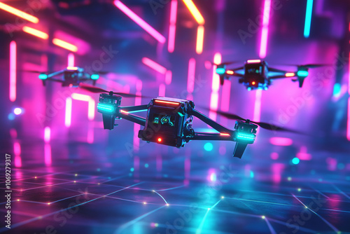 Drone Racing Arena in Technology Park with Neon Lights – Futuristic Air Sports Thrill