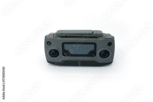 Drone Remote Controller with Antennas, Sticks, Display, and Phone Mount on White Background