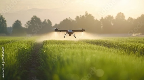 Drone spraying a field of crops. This image is perfect for illustrating agricultural technology.