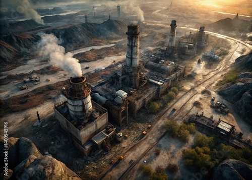Drone View: Desolate Coal Plant Landscape, Environmental Damage, Toxic Waste, Aerial Photography