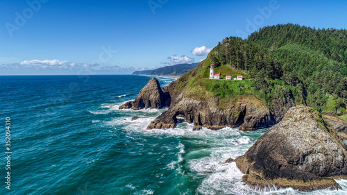 Drone view of Heceta Head Lighthouse on the Oregon Coast near Florence.