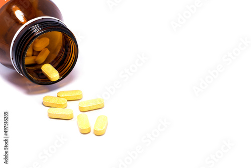 Drug bottle pouring out medicine pills or vitamin isolated.