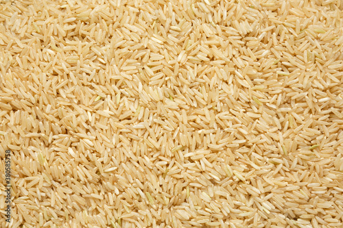 Dry Brown Rice background, top view. Overhead, from above, flat lay.