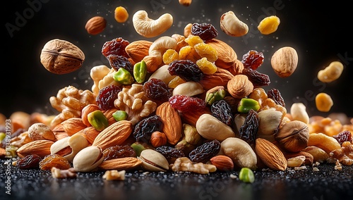 Dry fruits and mixed nuts levitating in mid-air healthy snack, almonds, pistachios, raisins, cashews, walnuts.