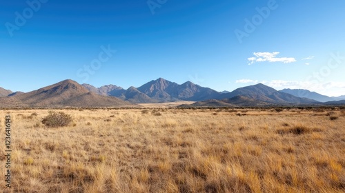 Dry grassland, mountain range backdrop, sunny day, travel destination
