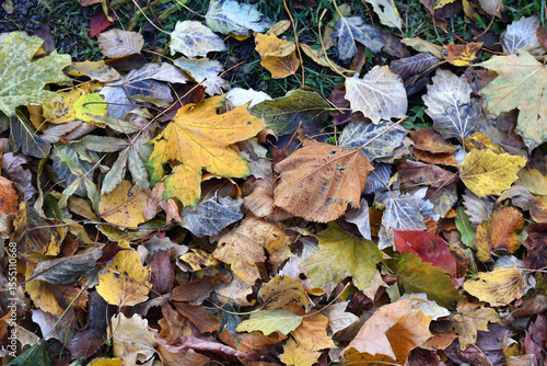 Dry leaves on the ground in a beautiful autumn forest. autumn background, fallen leaves in a forest or park. Grove. selective soft focus. autumn colors, beautiful season. autumn season, first frosts