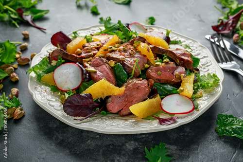 Duck breast fillets steak salad with orange halves, radishes and crushed pistachios