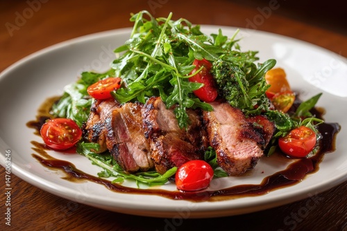 Duck breast served with arugula and tomatoes on a wooden table