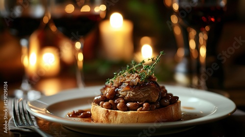 Duck confit with gourmet beans on toasted brioche, plated with a side of caramelized onions on a moody candle-lit setting