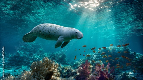 Dugong swimming near a coral reef with tropical fish around sunlight filtering through turquoise water
