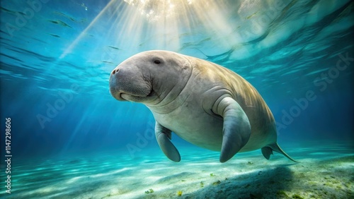 Dugong swimming near the sea surface, marine mammal, sea cow, underwater, ocean, wildlife, tropical