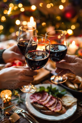 During a festive dinner, friends gather to clink glasses filled with red wine, enhancing the joyful and celebratory atmosphere of the event, creating a warm and vibrant ambiance full of holiday cheer