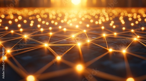 During dusk, a futuristic cityscape is illuminated by glowing bokeh lights that produce a dreamy atmosphere, with urban structures outlined against a warm, glowing background and defocused elements