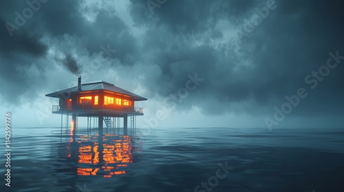 Dusk view of a bright offshore oil platform surrounded by industrial flames and generative art