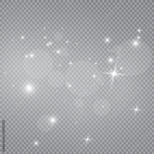 Dust white. White sparks and golden stars shine with special light. Vector sparkles on a transparent background. Christmas abstract pattern. Sparkling magical dust particles.