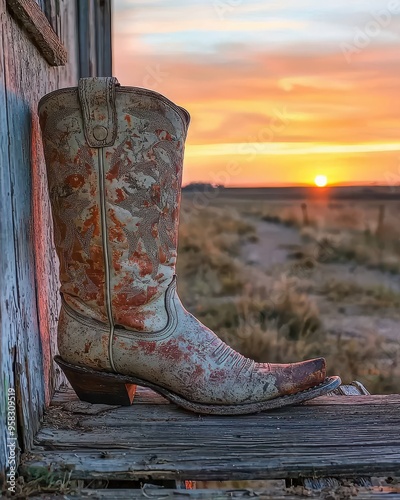 cowboy, boot, dusty, worn, weathered, wooden, porch, sunset, countryside, rustic, western, footwear, leather, horizon, rural, solitude, ranch, vintage, outdoors, single, nostalgia, prairie, traditional, old, travel, abandoned, heritage, dirt, farm, country, evening, peaceful, quiet, lonely, old west, frontier, boot, shoe, shoe, clothing, object, work, dirty, autumn