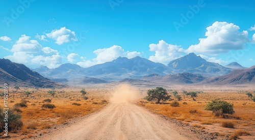 Dusty dirt road stretching through dry desert landscape with scattered shrubs and trees under blue sky with fluffy clouds and distant rocky mountains