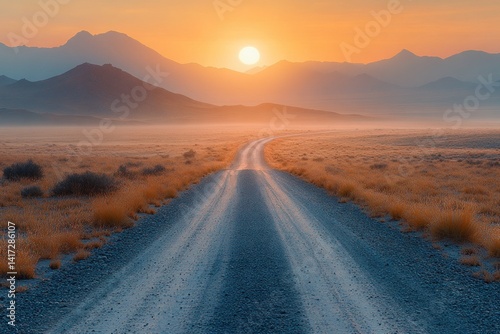sunrise, desert, road, mountain, landscape, travel, journey, adventure, exploration, horizon, nature, vista, path, wilderness, open, freedom, solitude, calmness, scenic, beauty, gold, light, fog, mist, dust, dry, grass, plain, view, photo, amazing, stunning, explore, vacation, relaxation, peaceful, calm, sunset, traveler, trip