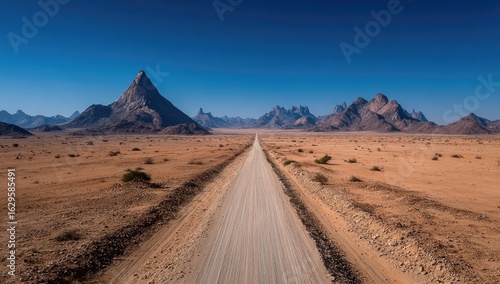 road, desert, mountain, landscape, dry, huge, arid, horizon, empty, travel, adventure, journey, panoramic, sunlit, sky, blue, peak, terrain, africa, nature, explore, scenic, vista, photo, dirt, gravel, vehicle, drive, beauty, freedom, exploration, rugged, solitude, distant, open, wide, light, brown, orange, sun, immensity, wide open, granite
