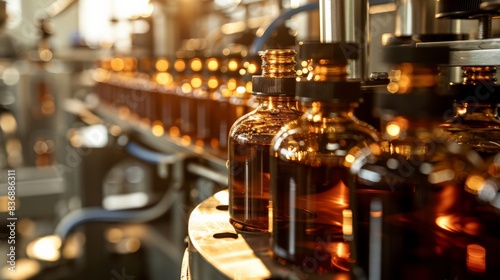 Dynamic angle of bottles being sealed with caps, showcasing sleek machinery design and rhythmic motion, enhanced by vibrant sunlight streaming in.