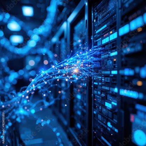 Dynamic Blue Fiber Optic Cables Connecting Data Servers in High-Tech Digital Environment