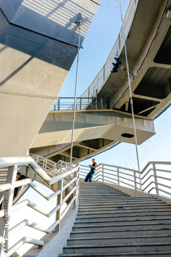 activity, architectural, architecture, banister, bridge, circular, city, city landscape, construction, contemporary, design, dynamic, engineering, figure, functional, geometric, balustrade, harmony, industrial, infrastructure, landmark, leisure, metal, modern, movement, outdoors, overpass, personal, perspective, public, railing, shadow, sky, stair, staircase, stair, steel, step, sunny, top, urban, walk, walking