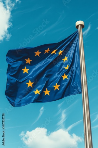 Dynamic Close-Up of Vibrant European Union Flag Fluttering Against Blue Sky Patriotic Symbol of Unity and Optimism