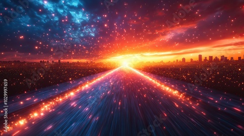 Dynamic colorful light streaks converging towards the horizon in a vibrant display.
