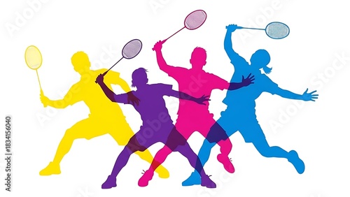 badminton, sport, player, action, silhouette, colourful, dynamic, athletic, movement, game, competition, shuttlecock, racket, swing, jump, energy, active, recreation, fitness, health, team, double, single, court, net, smash, serve, rally, victory, celebration, fun, illustration, graphic, design, vector, abstract, vibrant, bright, group, people, man, woman, youth, teenage, athlete, sportsmanship, leisure, indoor