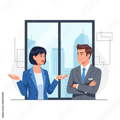 Dynamic Dialogue: A corporate setting captures a moment of discussion between two professionals, the scene rendered in a flat illustration style. the atmosphere exudes modern professionalism.