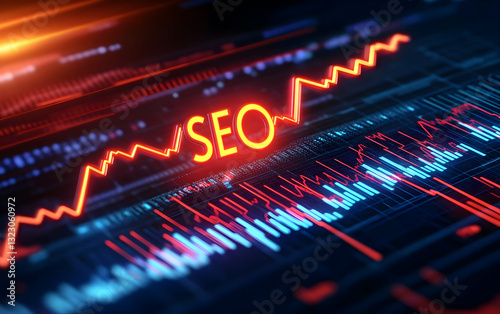 Dynamic digital illustration showcasing SEO growth trends and analytics represented through vibrant graphs and statistics.