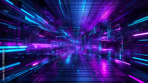 Dynamic futuristic digital tunnel with vibrant blue and purple neon light lines creating an illusion of rapid data flow and advanced technological networks