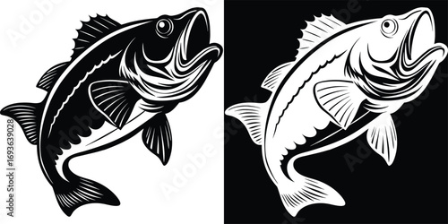 bass, fish, sport, fishing, water, nature, animal, wild, aquatic, predator, hunter, aggressive, jump, leap, action, movement, dynamic, energy, power, strength, graphic, design, illustration, icon, logotype, symbol, silhouette, black, white, modern, simple, clean, bold, sportfishing, angling, recreation, hobby, outdoors, adventure, wilderness, wildlife, fresh water, marin, lure, editable, white background