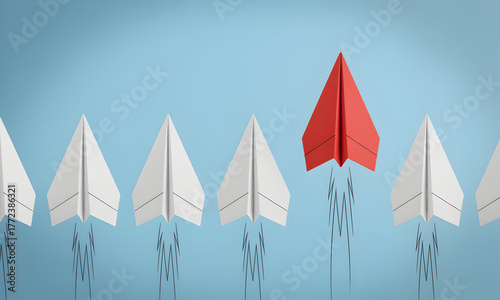 Dynamic red paper airplane soars ahead of white flock, symbolizing innovation, individuality, and achieving success against the odds in a vibrant blue sky