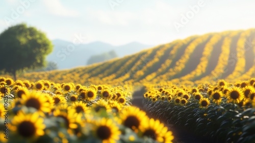 sunflower, field, nature, landscape, bright, sunlight, summer, bloom, vibrant, growth, flower, agriculture, rural, scenery, flower petals, flora, green, environment, photo, horizon, peaceful, view, joy, sunshine, beauty, freshness, calmness, season, scenic, colourful, natural, background, blossom, closeup, meadow, day, daylight, ray