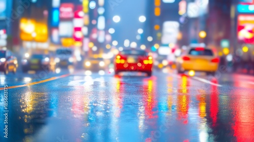 Dynamic urban street scene capturing blurry cars and pedestrians navigating wet reflective pavement at night highlighting city motion and vibrant atmosphere.