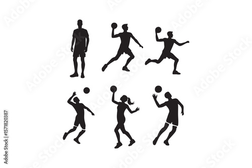 Dynamic Volleyball Players Silhouette Set.A collection of black silhouette illustrations of male volleyball players in various dynamic action poses.