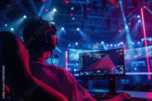 e sport EVENT live streamingA gamer immersed in an esports event, focused on the screen, surrounded by vibrant lights and sounds of competition.