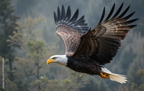 eagle, flying, forest, bird, flight, wing, animal, wildlife, nature, predator, feather, sky, outdoors, soaring, avian, tree, landscape, environment, wild, freedom, strength, power, eye, beak, head, detail, looking, background, blur, day, colours, profile, side, scene, natural, open, motion, tree branch, countryside, travel, peace, harmony, calm, serene, atmosphere