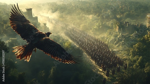 eagle, bird, soaring, flight, wing, army, soldier, marching, forest, tree, ancient, battlefield, war, conflict, historical, landscape, vista, view, aerial, perspective, mythology, legend, power, strength, thews, majestic, ruin, castle, structure, road, path, dust, sun, light, morning, mist, fog, shadow, green, brown, gold, colours, image, artwork, illustration, digital, painting