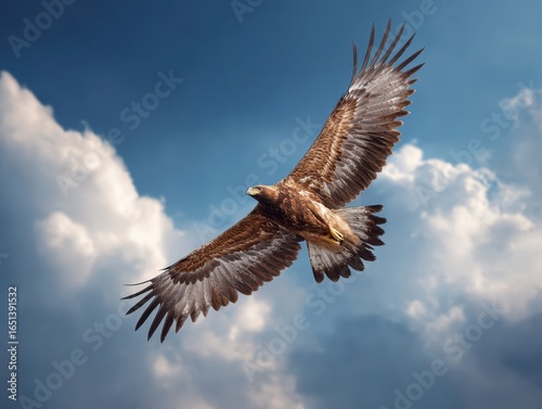 Eagle Soaring High with Wings Spread, Amidst Clear Blue Sky and Fluffy Clouds