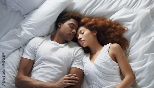 valentine, february 14, white, interracial, mixed, couple, woman, bed, love, bedchamber, sheet, sleeping, pillow, young, ginger, shirt, curly, hair, sleep, nap, attractive, romantic, wedding, marriage, hold, hug, touch, enjoying, enjoy, lover, human relationships, magic, fashion, advertisement, together, happy, lying, peace, peaceful, relaxing, married, studio, mag, web, website, page, offer, sale