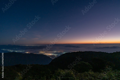 Early morning night sky from the top of Doi Luang Chiang Dao in Chiang Mai, Thailand overlooking a glowing town lights and beautiful dark blue sky