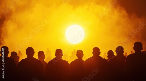 Early morning Vesak prayer with monks facing sunrise behind temple silhouette