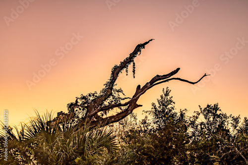 Early morning view of a field and tree lit up by the morning colorful sky Florida, USA