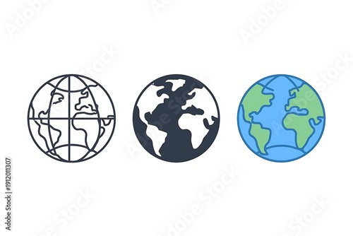 Earth globe icon set featuring world map, planet and global communication symbols.
