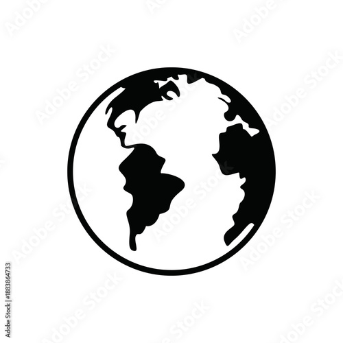 Earth Globe Icon with Continents Black and White Minimalist Vector Illustration of Planet World Map Silhouette for Global Travel Environment and Sustainability Concepts