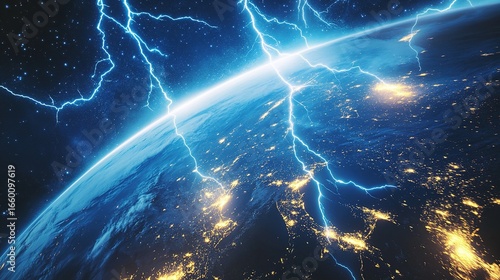 Earth Under Cosmic Starry Sky, Lightning and Nebula Interweaving, Sci - Fi Space Scene