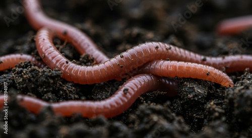 Earthworms in Rich Soil Close Up - A detailed close-up of earthworms reveals their segmented bodies, intricate textures, and vital role in soil health, symbolizing nature, decomposition, fertility