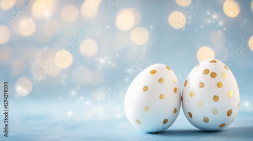 Easter - themed wallpaper with two white eggs dotted with golden spots on a light blue background, surrounded by a soft bokeh effect for a festive touch.